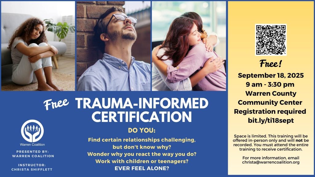 Due to overwhelming demand, Warren Coalition will again offer a free Trauma-Informed Certification Class (Course 1) on September 18, 2025, from 9 am to 3:30 pm at Warren County Community Center (538 Villa Ave).