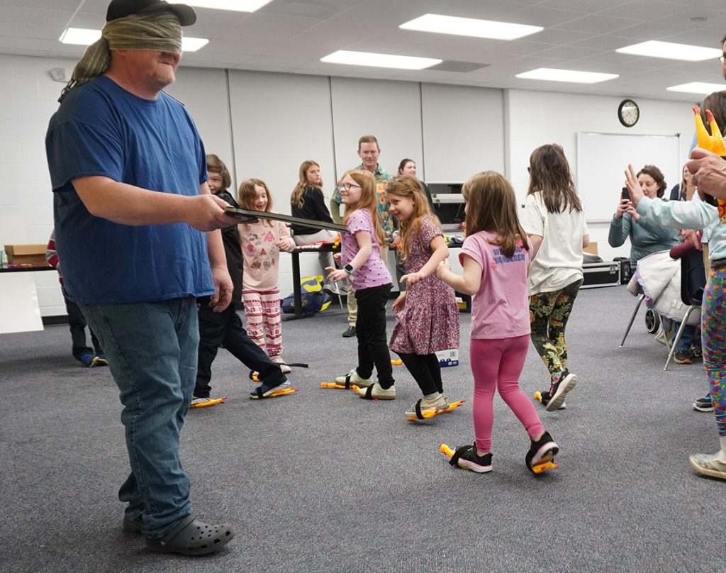 A blind-folded volunteer, Jason Neale, chases children with a foam sword. The children had rubber chickens strapped to their feet. The goal was to not get hit with the sword, but if the chickens didn’t give away the kids, their happy squeals and laughter did!