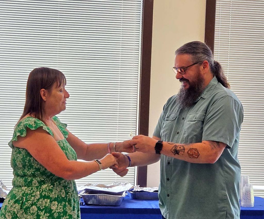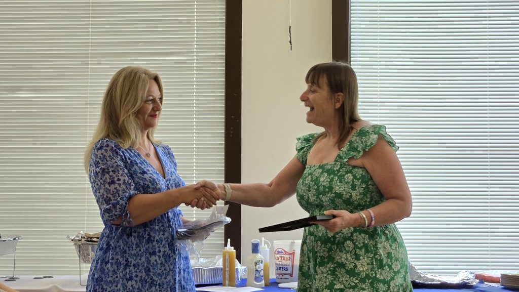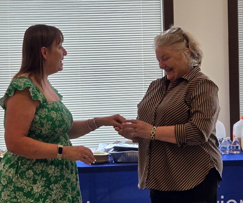 Executive Director Christa Shifflett presents Secretary Holly Goode with a pin, given in appreciation for Holly’s consistent presence at meetings.
