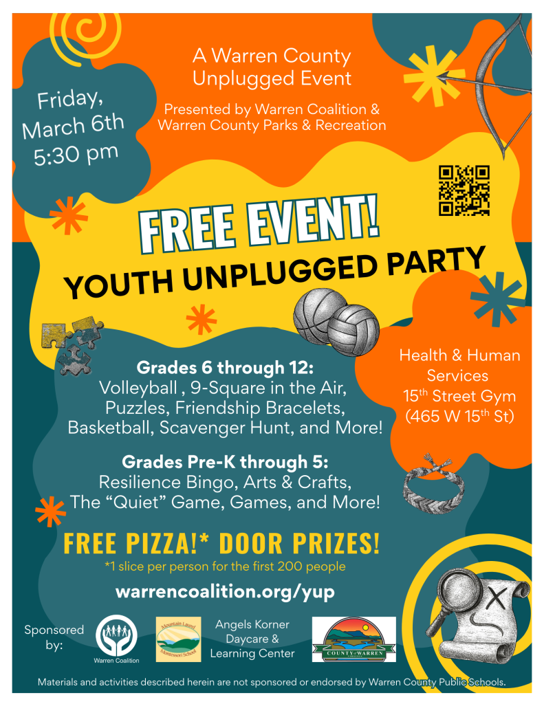 Join us Friday, March 6th for the second annual Youth Unplugged Party! This event is for kids from ages 4 to 18, from 5:30 pm to 10:00 pm. Put down your phones and have some fun! Click here to learn more, or email us if you have questions!