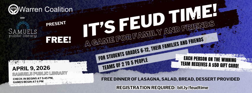 This event is intended for middle school and high school students in Warren County, and their families and friends. There is no cost to attend, but registration is required. Complete the registration form at https://bit.ly/feudtime.
